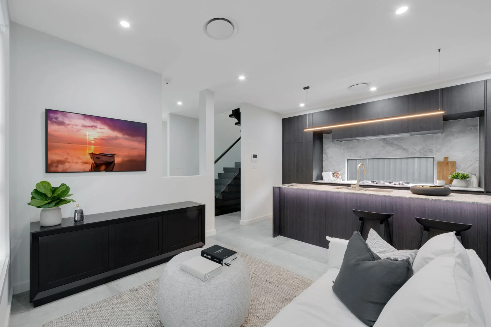 - Fully equipped kitchen with stone bench-tops, premium stainless steel appliances, gas cooktop, rangehood, and oven
